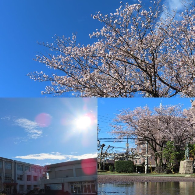 正門横や運動場の北側、藤だな横、体育館横の桜など、きれいに咲いています。
