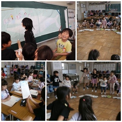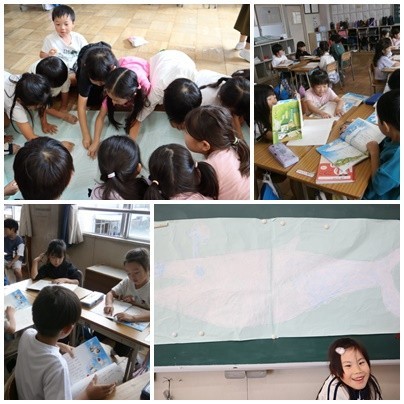 学級の子どもたちに「どんな風にこのお話を勉強したい?」と聞くと、「『おおきなかぶ』のときのように、みんなで動きをつけて音読がしたい。」とのことでした。それからどんどん、子どもたちの想像はふくらみ「みんなでおおきなくじらをつくろう。」「お話にある、『こどもたちを空へふきとばした風』は、教室の扇風機を使おう。」「私たちは子ども役をやるから、先生はくじら役、先生役をやってね。」とたくさんの意見がでました。