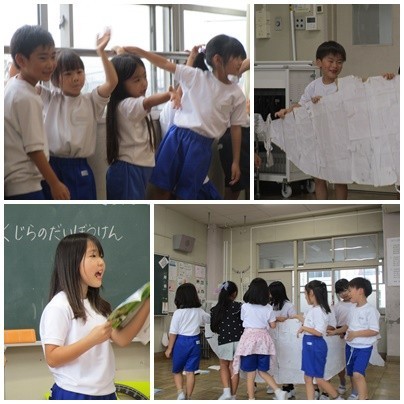ナレーター、先生、子ども達、くじらぐも。それぞれの役になりきって発表できました。