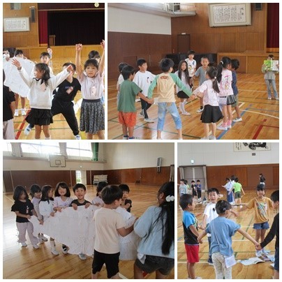 学級の子どもたちに「どんな風にこのお話を勉強したい?」と聞くと、「『おおきなかぶ』のときのように、みんなで動きをつけて音読がしたい。」とのことでした。それからどんどん、子どもたちの想像はふくらみ「みんなでおおきなくじらをつくろう。」「お話にある、『こどもたちを空へふきとばした風』は、教室の扇風機を使おう。」「私たちは子ども役をやるから、先生はくじら役、先生役をやってね。」とたくさんの意見がでました。