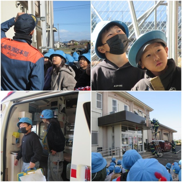 今日は江南消防の東分署へ行きました。実際に救急車や消防車に乗せていただいたり、中の設備を見せていただきました。また、訓練の様子も見せていただくことができました。普段は見ることのできない消防署の様子を見ることで学びを深めることができ、貴重な体験となりました。見学したことをもとに、今後の学習につなげていきましょう。 -