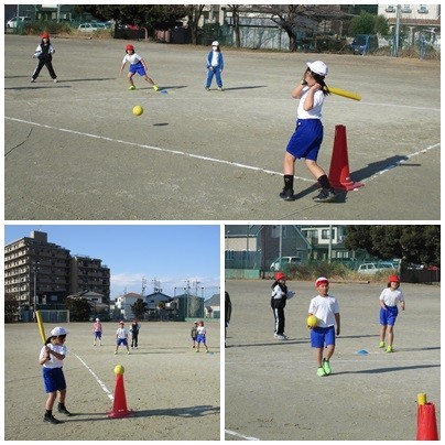 体育で、「ボール運動(ベースボール型 簡易版ティーボール)」の授業を行いました。先端部分を切り取ったバッティングティー用コーンの上にハンドボールを置いて、打つ練習と守る練習をしました。今日は先生がルールを決めましたが、次回からは全員が楽しみながら学習できるように、みんなで話し合いながらルールを決めていく予定です。 -