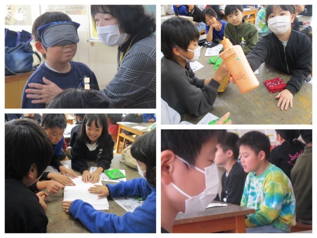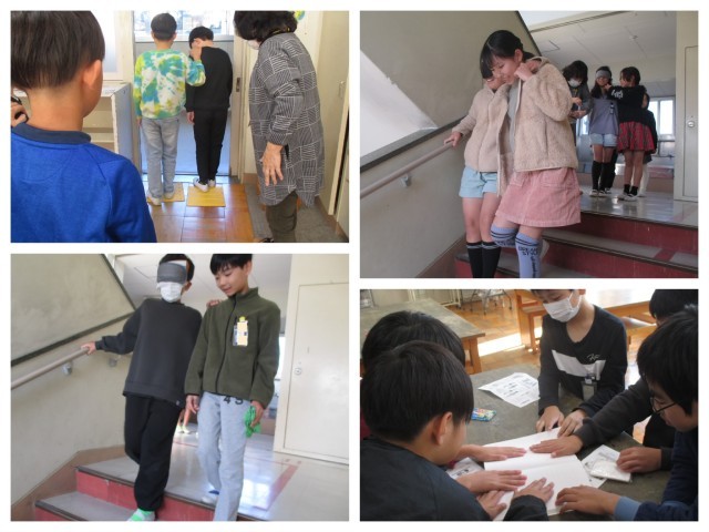 今日は福祉実践教室で「視覚障がい者」について学びました。人間の情報は80%が目で見て得ることを知り、実際にアイマスクをして階段の上り下りをしました。目で見えないから手や足を使って周りの状況を把握しようと頑張っても、少しの段差がどれだけ怖いか身に染みて分かる体験をして、子どもたちも今の自分たちに何ができるか真剣に考えるきっかけになりました。