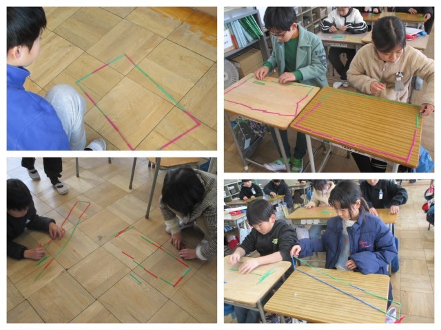 今日は算数の「変わり方」の授業を行いました。18本の数え棒を使ってどんな長方形が作れるか考え、できたものを表を使って表しました。たての本数と横の本数を比べて「いろんな長方形ができる!」「たては何本までいけるかな?」と作りながら一生懸命考えることができました。