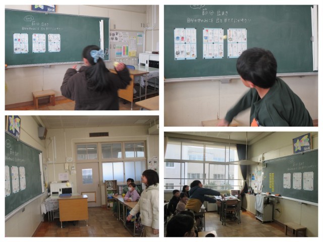 今日は4年3組では「自分の中のおにを退治するぞ!」ということで自分たちで作った豆で豆まきをしました。「わすれんぼうおに」や「ぼんミスおに」などたくさんのおにの中で、「自分のおにに当てるぞ!」と気合いを入れながら楽しく豆まきをしました。