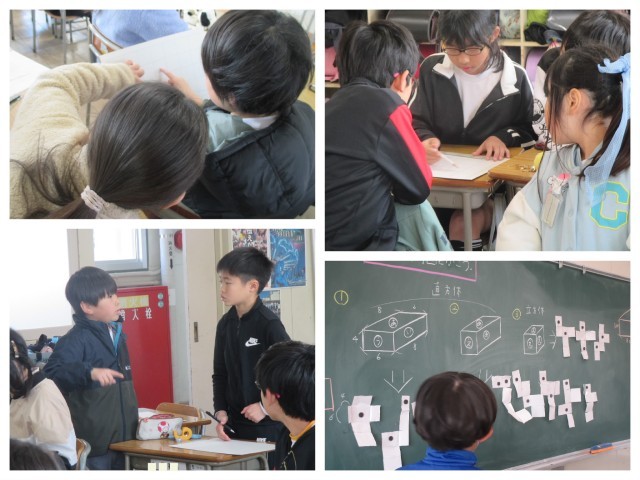 今日は算数の「直方体と立方体」の授業で、直方体の展開図を工作用紙を使って描き、作りました。周りの友達と話し合ったり、何度も確認したりして一生懸命展開図を描いていました。