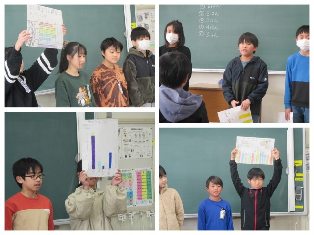 今日は国語で先日アンケートを取ったものをクラスのみんなに発表をしました。自分たちでアンケートを分析して、クラスの傾向を知り、分かりやすくグラフや表を使って発表することができました。