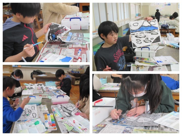 今日は、先週刷った版画に絵の具で色をつけていきました。初めは思うような色が出なくて何度も表面を見ながら色付けをしていましたが、水の量を調節したり、薄い色に濃い色を重ねる工夫をしたりしてすてきな作品が出来上がりました。最後は額に飾ってみんなで見あうことができました。