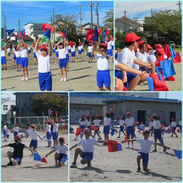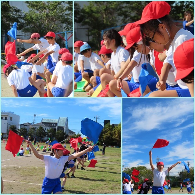 今日はフラッグを使って、ウエーブの練習をしました。一人ではできないことですが、みんなとつくり上げることで完成します。はじめはバラバラだったウエーブも、隣の人を意識して繋げることができてきました。子どもたちからも、みんなで納得いくものを作りたい、見せたいという思いが練習する姿から伝わってきます。