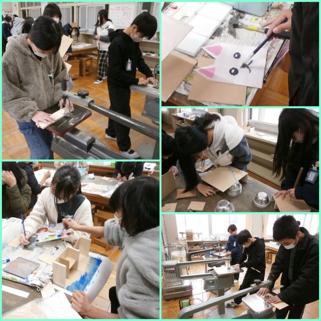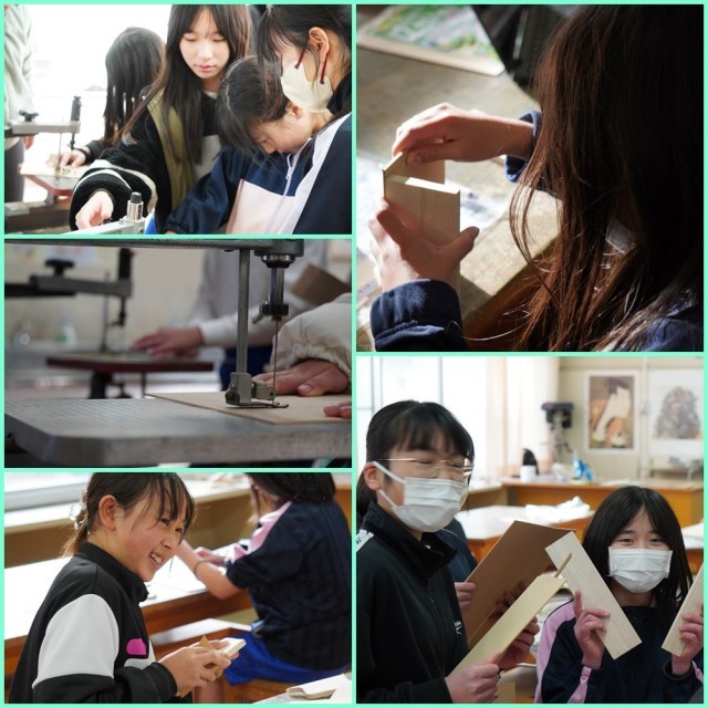 図画工作科の学習では、板を使って、生活の中で使えるものを作成しています。