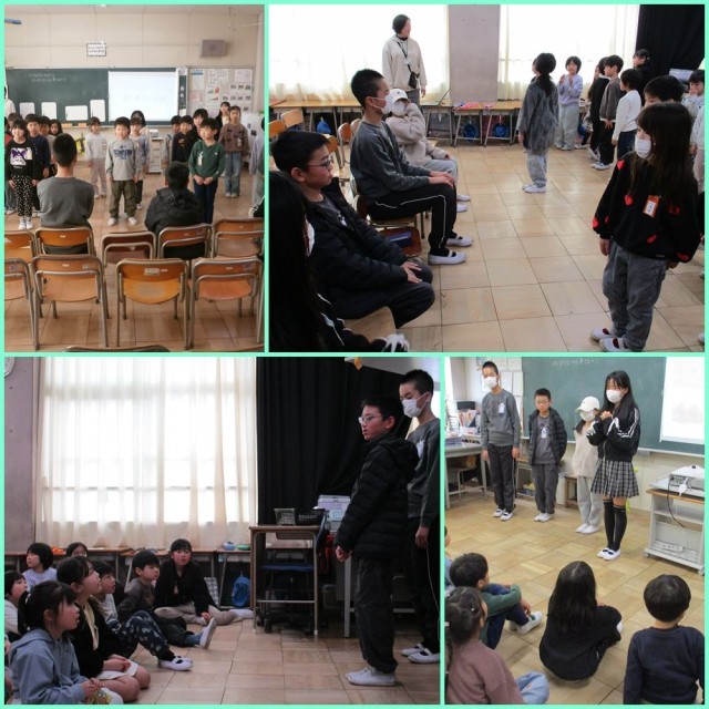 1年生の先生方から「1年生の発表を見て、アドバイスがほしいです。」という話があり、代表の子どもたちが1年生の発表を見にいきました。