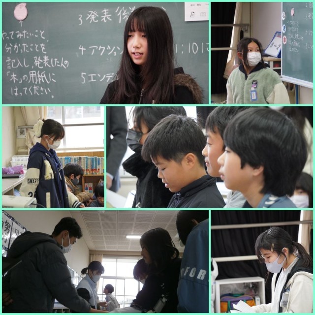 今日は、5年生を教室に招いて、6年生の発表を聴いてもらいました。(2組はクラスの仲間同士で発表をしました。)