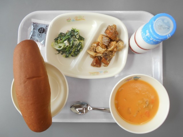 クロロールパン ぎゅうにゅう サーモンのつぶマスタードいため ほうれんそうサラダ にんじんポタージュ ブルーベリージャム 734kcal