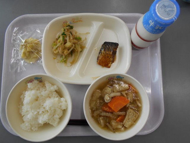 ごはん ぎゅうにゅう さばのはっちょうみそに はくさいのおかかあえ だいこんのすりながしじる おにまんじゅう 641kcal