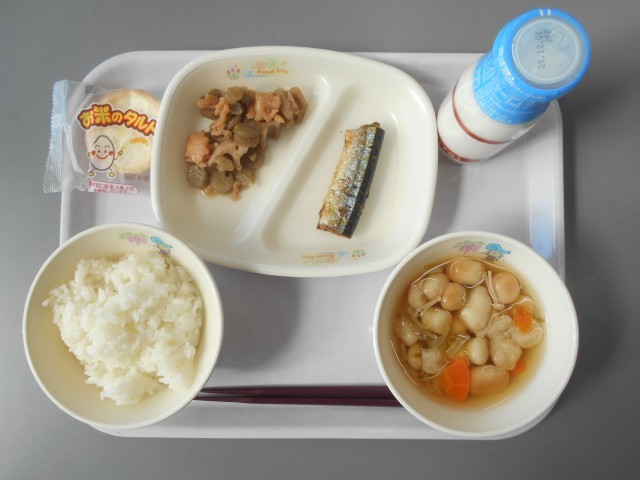 ごはん ぎゅうにゅう さんまのおろしに ふきよせに ふだまじる おこめのタルト 686kcal