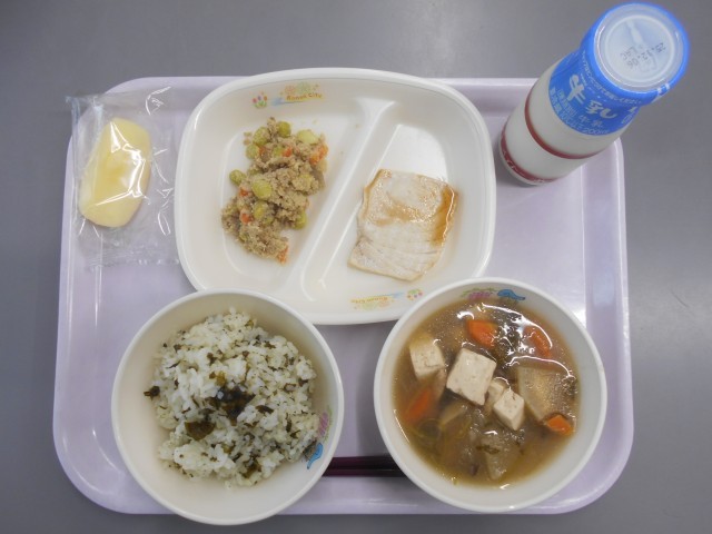 わかめごはん ぎゅうにゅう かじきのてりやき おからとえだまめのいりに すりおろしれんこんのけんちんじる りんご 580kcal