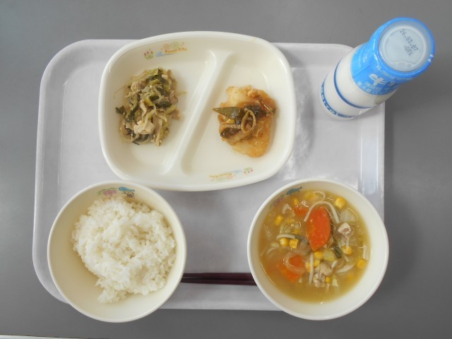 ごはん ぎゅうにゅう かれいのこうみだれ あおないため ちゅうかふうコーンスープ 591kcal