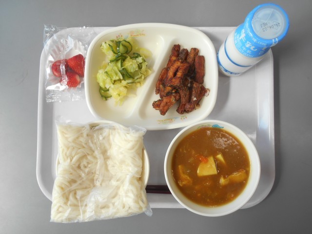 しらたまうどん ぎゅうにゅう カレーうどん にしんのたつたあげ きゅうりのさっぱりあえ