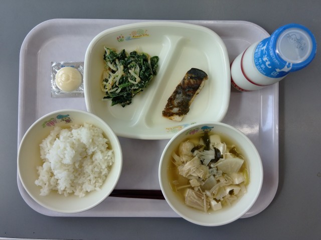 ごはん ぎゅうにゅう むしさわらのうめだれ ほうれんそうのごまあえ