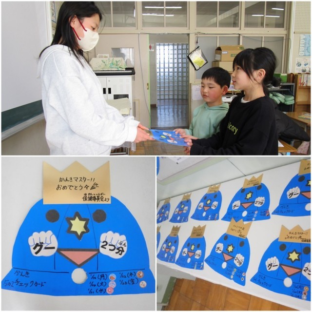 今日は、先週行われた「健康チェック週間」中に、換気がしっかりできていたクラスに、保健委員会オリジナルの表彰状を渡しに行きました。すべてのクラスに表彰状を渡すことができました。