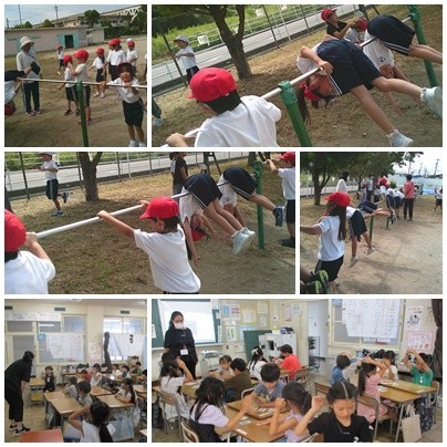 今日は2・3組は体育で鉄棒をしました。1組は楽しく外国語を学びました。