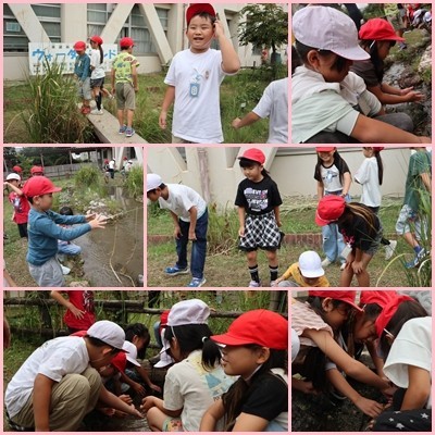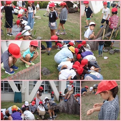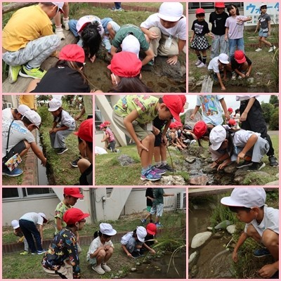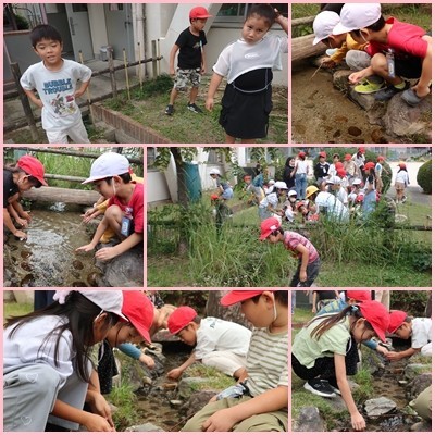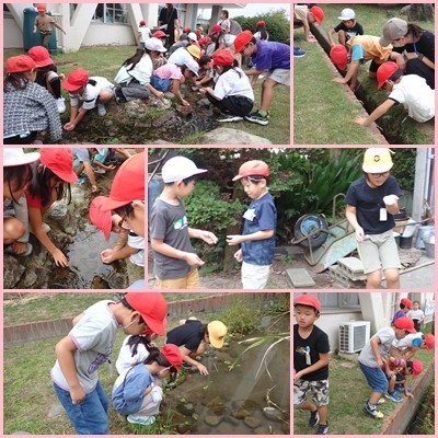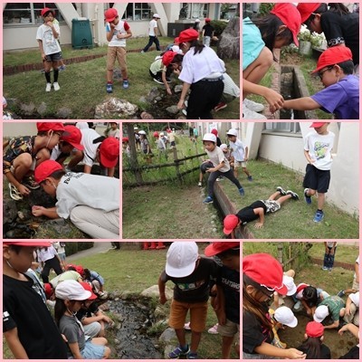 子ども達はウォーターランドが大好き! 魔法にかけられたほうに、2時間目の間ずっと夢中で手を水につけて遊んだり、探索したり、生き物の観察をしたりしていました。子ども達の視線はずっと下、顔をぐぐっとウォーターランドに近付けているため、たくさん写真を撮りましたが頭ばかりになってしまいました。それだけ、子ども達がウォーターランドに魅了されていると思っていただければ幸いです。