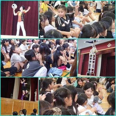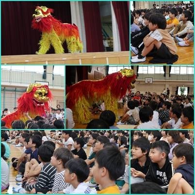 今日は、お昼から芸術鑑賞会がありました。中国雑技団の方の技を見させていただきました。ししまいが近くに来た時には、ちょっとびっくりしましたね。皿回しや一輪車などいろいろな技を見て、「すごーい!!」と目を見開いて拍手をしながら驚く姿が見られました。最後の積み重ねた椅子の上で倒立する技を見たときには、体育館全体がとても盛り上がりました。普段、なかなか見ることのできない技をたくさん見させていただき、楽しかったですね。また、お家でもたくさん話してみてくださいね。