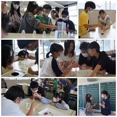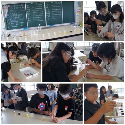 今日の理科の授業では、リトマス試験紙やBTB溶液をつかって、身の回りにあるさまざまな液体を調べました。酸性・中性・アルカリ性を区別していく中で、驚きや新たな発見・疑問が生まれている様子でした。学習した知識を活用して、グループで学びを深めることができましたね。