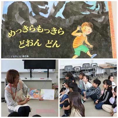 今日はナンジャモンジャさんによる昼読みがあり「めっきら もっきら どおん どおん」を読んでいただきました。主人公の男の子は、地面に不思議な文字を見つけます。「めっきら もっきら どおん どおん」その言葉を唱えると、あら不思議! 辺りが急に暗くなって、見たこともない、へんてこな世界へ迷い込んでしまいました!