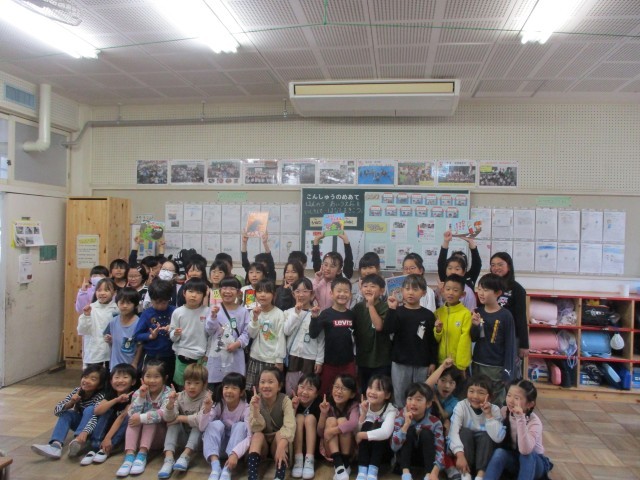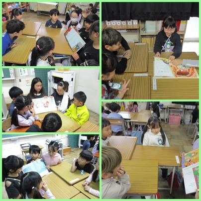 とってもたのしい絵本を読んでくれました。1年生は絵本の世界に引き込まれ、最後まで聞き入っていました。3年生さんありがとう!!