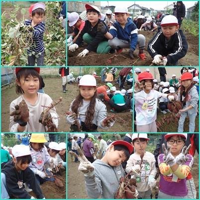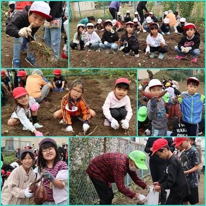 いも堀りでは、ボランティアさんの話をよく聞き、ツルや葉っぱの片付けの後、いも掘りをしました。一人では、なかなか掘ることができない大きさのさつまいももあり、友達と協力しながら掘る姿が多く見られました。最後は、ボランティアさんから一人ずつさつまいもをもらいとても喜んでいました。
