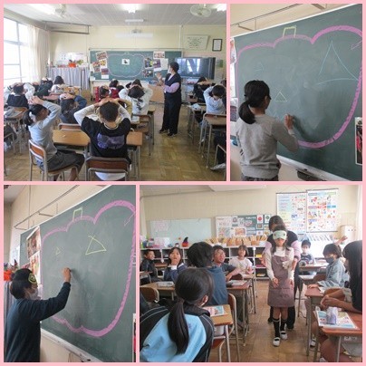 外国語の学習では、ハロウィンが近いことにちなんで、ハロウィンをテーマにしたゲームを行いました。「右」「左」「真っすぐ」などの方向や、絵を描く場所を英語で伝え合いながら活動しました。英語でのやりとりに笑顔が溢れ、楽しい時間となりました。