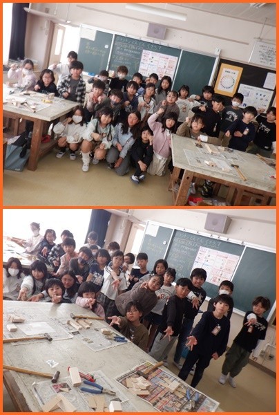 前時に教室で全員くぎ打ちの練習をしてから臨んだので、どの子もスムーズに、しかもけがすることなく活動を進めることができました。次の時間に鑑賞をして友達の作品を楽しんでから持ち帰る予定です。帰りの会の振り返りでは、本当に多くの子が図工のことを挙げていました。