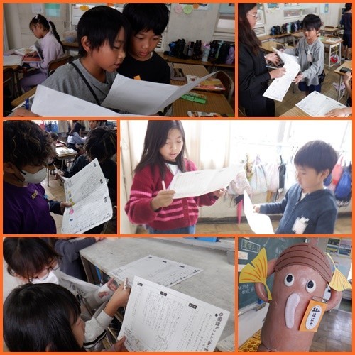 国語は「すがたをかえる大豆」に引き続き、「食べ物のひみつを教えます」の学習に取り組んでいます。大豆のところで学習したことを生かして、姿をかえる食品を選び、図や文章にまとめています。今日で完成予定なので、友達同士で交換して読み合いをしました。友達からのアドバイスをうけて、さらに完成度の高い文章になるといいですね。