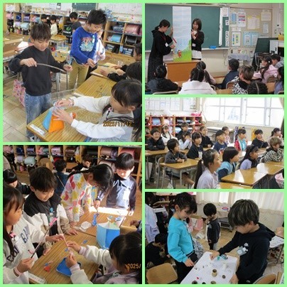 生活科の学習では、みんなが作ったおもちゃで遊びました。どの子も工夫ある楽しいおもちゃを作ることができました。おうちの方には、材料集めにご協力いただき、ありがとうございました。