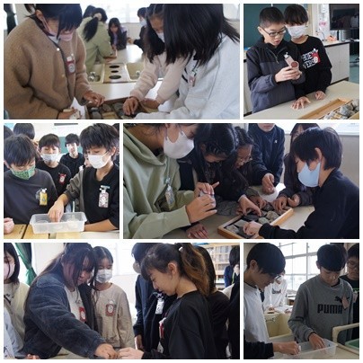 理科の学習では、「大地の変化とつくり」の単元を学習しています。普段生活している地面のその下の世界を想像し、考えを深めています。地層はなぜ縞模様に見えるのか、粒の大きさや色に注目しながら、いろいろな岩石を手に取り観察しました。