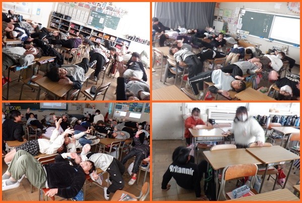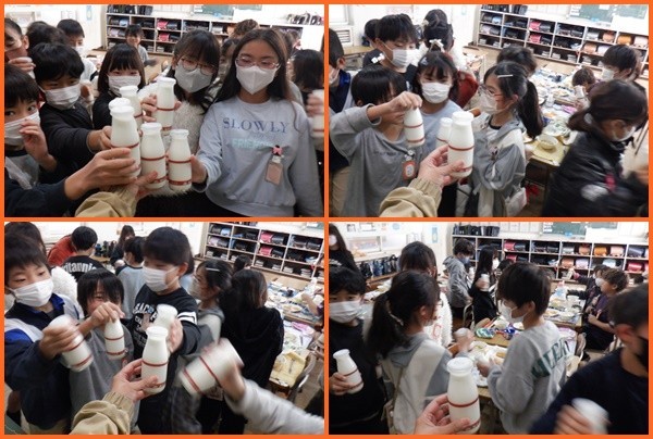 ひとつめの写真は、国語の時間の様子です。なぜ机の上に寝転んでいるのかって?それは・・・「三年とうげ」の登場人物の動作化をしているからです。この場面では、おじいさんが「はねおきる」ところを全員でやってみました。また、この時間に全員が 音読チャレンジで挙手をしたので、給食の時間に牛乳かんぱいでお祝いをしました。アクション国語、盛り上がりましたね!