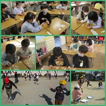 今日は、お休みが多く人数が少ない日でした。人数が少ないながらも、登校した子達は縄跳びや計算カードに一生懸命取り組み、元気いっぱいに過ごしました。