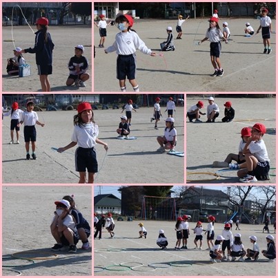 体育では、跳び遊びをしています。縄跳びをしたり、自分達で片足跳びや両足跳びなどを混ぜた「けんけんぱ」のコースを作ったりしながら、楽しんでいます。