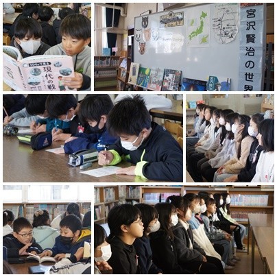 1組は今日の5時間目に、2組は先週の金曜日に、図書館司書の中西先生によるブックトークがありました。今回は国語の教科書にも載っている「宮沢賢治の世界」をテーマに、たくさんの本を紹介していただきました。ブックトークが終わってから、それぞれ興味をもった本を手に取り、読書にいそしむ様子が印象的でした。中西先生、ありがとうございました。