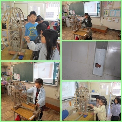 今、国語の学習では「たぬきの糸車」で、たぬきとおかみさんの気持ちや様子を考えています。今日は、実際に糸車を回したり、たぬきになりきって穴からのぞいたりする活動を取り入れながらふたりの気持ちを考えました。