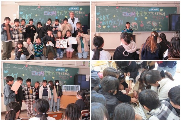 今年宮田小学校に来てくれたモルモットのモッチーと、今日がお別れの日でした。今までたくさんの笑顔をくれたモッチーにありがとうの気持ちを込めて、ささやかなお別れの会を開きました。みんなの心のこもった手紙や歌をモッチーに届けることができてよかったね。