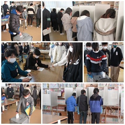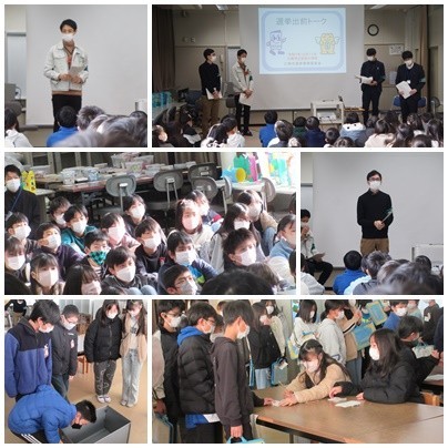 今日は、江南市役所の選挙管理委員会の方々を講師としてお招きし、選挙についお話していただきました。選挙の仕組みや意義などの説明を聞き、政治や選挙が自分たちの生活と深く関わっていることを学びました。また、講座の後半では、実際の選挙で使われている本物の投票箱や記載台、投票用紙などを使って、模擬投票を体験しました。候補者の演説を聞き、どの候補者に投票するかを考えることで、選挙のリアリティを体験することができました。