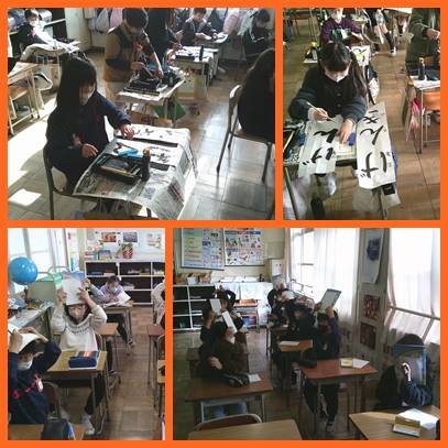 書写では、冬休みの宿題として取り組む「書き初め半紙」に「げんき」という文字を練習しました。書き初め半紙の折り方や、文字のバランスを考えた書き方を練習することができました。外国語活動では、「これは何?クイズ」に取り組みました。また、おでこに紙を当てて見えないようにしながら絵を描きました。おもしろいイラストが完成して、みんなで笑い合うことができました。