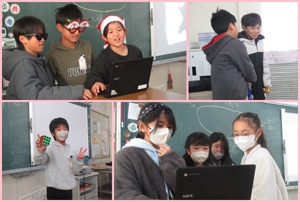 今日は2学期最後の日でした。2組では学級レクを行いました。クイズ、ピアノ演奏、ルービックキューブ、漫才など、一人ひとりが考えた出し物が披露され、教室はたくさんの笑顔であふれました。みんなで笑い、考え、温かい時間を過ごすことができました。
