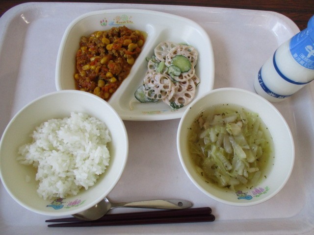 今日は食育の日の献立です。ドライカレーに入っている大豆は愛知県産です。県内でとれる大豆は主にフクユタカという品種で、たんぱく質の含有量が高く、甘みがあります。