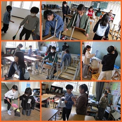 今日は、給食の後の清掃時間の様子を紹介します。友達と協力しながら担当の場所を時間いっぱいきれいにしようと取り組む姿がすばらしいですね。今週も体調に気を付けながら過ごしていきましょう。