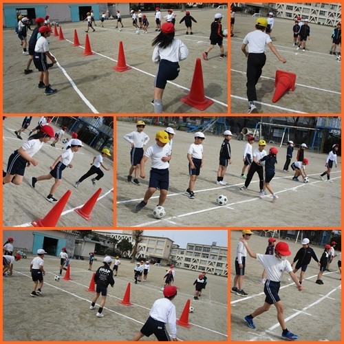 運動場での体育は、サッカーに取り組み始めました。まずはボールをしっかりととめて正確にける練習からしています。ボールにさわればさわるだけ上手になりますよ。めざせ、「ボールは友達!」