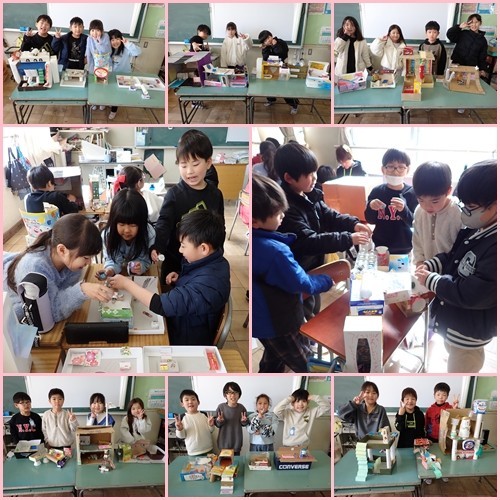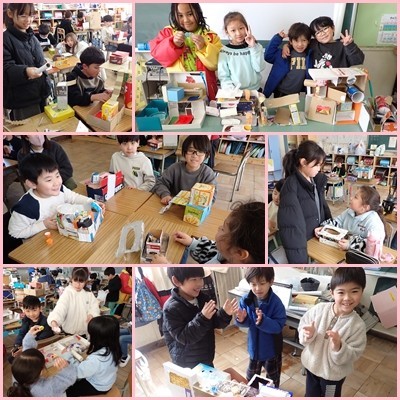 今週は、図画工作の「ともだちハウス」づくりを行いました。家がどんどん大きくなる子、いろいろな家具や電化製品をつくる子、プールやブランコなどの遊び場がお家にできた子など、どの子も真剣に取り組み、とても豪華なお家がたくさん完成しました。友達の作品を鑑賞する際には、「えー!これすごい!本物みたい。」「楽しそうな家だね。」「ここが開いて入れるよ。」など友達の作品に感動する声や自分の作品を紹介する声が聞こえました。素敵なお家がたくさん出来上がって楽しかったですね。