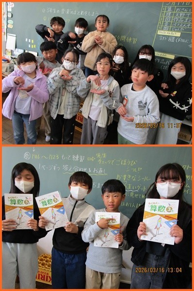 給食はたくさんの子が残さずに食べることができました。また、算数も教科書に載っているすべての問題をクリアーした子が現れました。いろいろな学習や活動が最終回を迎えています。3年生も残りあと4日!